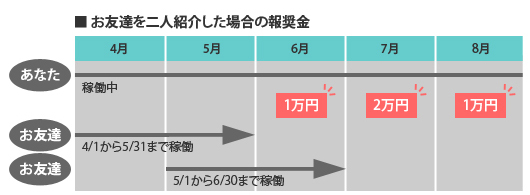 ご紹介いただいた方が契約社員として弊社と契約し一ヶ月以上案件に参画した場合、以降毎月1万円の報奨金を受け取ることができます。この報奨金は、ご紹介いただいた方とあなたが弊社との契約社員契約を継続する限り続きます。